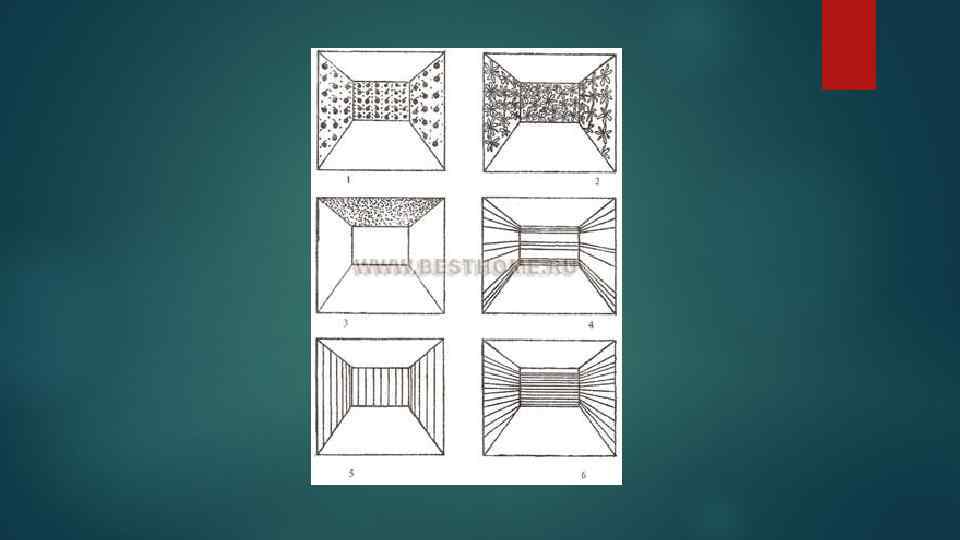 КАК РИСУНОК ИЗМЕНЯЕТ ОПТИКУ ПРОСТРАНСТВА 1. Крупный рисунок: в данном случае на задней стене - укорачивает и уменьшает комнату, притягивая к себе внимание. 2. Мелкий рисунок: увеличивает и раздвигает комнату, особенно если в нем преобладают светлые тона. 3. Поперечные полосы: раздвигают стены, а комнату делают ниже. На задней стене - укорачивают помещение. 4. Вертикальные полосы: удлиняют стену, комната кажется благодаря этому выше. Чем шире полосы, тем сильнее эффект. 5. Поперечные полосы на полу: оптически делают комнату шире и короче. 6. Полосы в длину на полу: удлиняют комнату тем больше, чем шире полосы и чем сильнее их цвет.