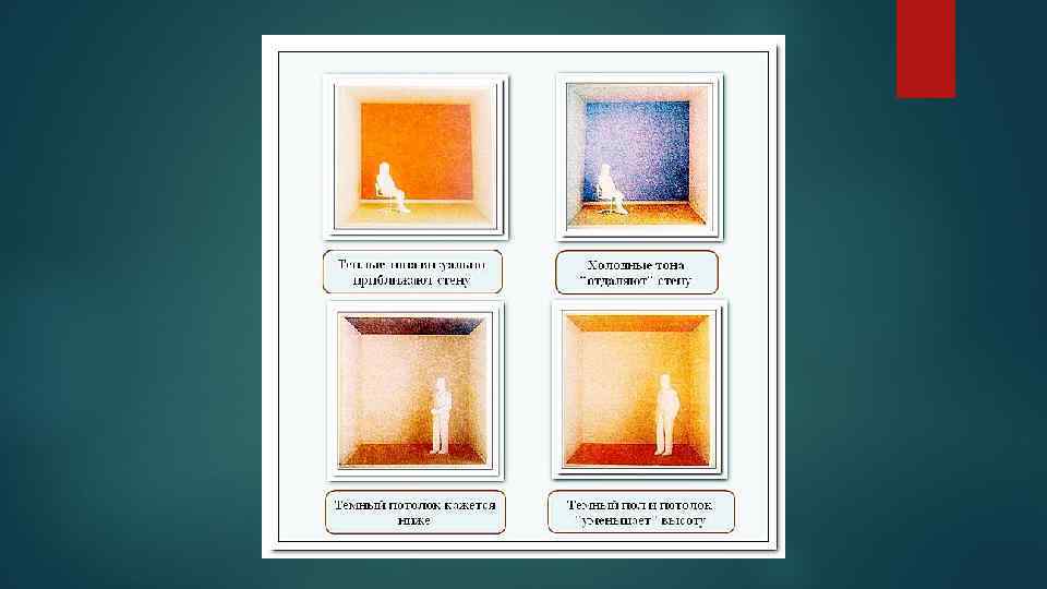 Отступающие цвета стен и потолка, выступающий – пола Форма воспринимается как подлинная. Ощущение устойчивости пола, раскрытия, расширения и легкости пространства Выступающие цвета фронтальной стены, пола и потолка, отступающие – боковых стен Ощущение изменения формы, ограничения пространства по высоте и глубине, его понижения и расширения Выступающий цвет фронтальной стены, локальные – боковых стен и пола, отступающий – потолка Изменение формы. Ощущение сокращения глубины, фронтальный характер пространства, значимость фронтальной плоскости Пол и нижняя часть стен окрашены в выступающие цвета, стены и потолок – в отступающие Изменение пропорций, расширение и легкость пространства, ощущение надежности пола, зрительное увеличение его площади Вертикальные, линейные элементы и пол окрашены в выступающие цвета. Стены и потолок – в отступающие или локальные Выявление глубинности пространства, ритм членения приобретает в пространстве ведущее значение