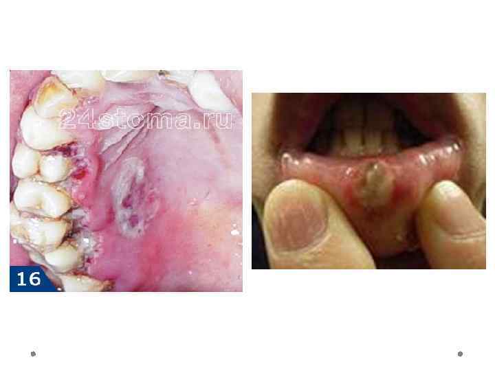Язвенный стоматит • Течение язвенного стоматита более тяжелое, болезнь может развиваться самостоятельно или быть следствием запущенного катарального стоматита (при несвоевременном обращении за медицинской помощью, неправильном лечении). Чаще всего язвенный стоматит возникает у больных язвенной болезнью желудка и двенадцатиперстной кишки или хроническим энтеритом в период обострения, может наблюдаться также при заболеваниях системы крови, некоторых инфекционных заболеваниях, отравлении солями тяжелых металлов. При язвенном стоматите в отличие от катарального патологический процесс затрагивает не только поверхностный слой слизистой оболочки рта, но всю ее толщу. При этом образуются некротические язвы, проникающие глубоко в подлежащие ткани; эти участки некроза могут сливаться между собой и образовывать обширные некротические поверхности. Возможен переход некротического процесса на костную ткань челюстей и развитие остеомиелита.