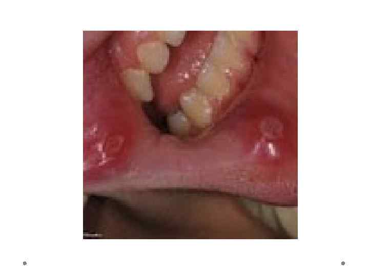 Афтозный стоматит • Характерно появление на слизистой оболочке рта единичных или множественных афт. Наиболее часто оно поражает людей, страдающих различными аллергиями, ревматизмом, болезнями желудочно-кишечного тракта, подвергшихся атаке вирусной инфекции. • Первые симптомы начинающегося афтозного стоматита – общее недомогание, повышение температуры, апатия и подавленность, сопровождающиеся болевыми ощущениями во рту, в общем анализе крови отмечается небольшая лейкопения и повышение СОЭ до 45 мм/ч. Затем на слизистой оболочке полости рта появляются афты – небольшие (с чечевичное зерно) очаги округлой или овальной формы, четко отграниченные от здоровых участков узкой красной каймой, в центре они покрываются сероватожелтым налетом, обусловленным отложением фибрина. В своем развитии они проходят четыре стадии: продромальную, афтозную, язвенную и стадию заживления. Афты могут заживать самостоятельно, без рубца.