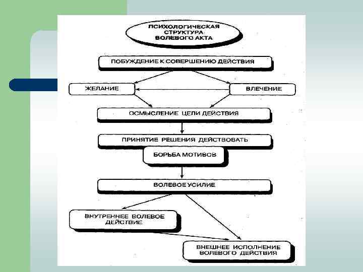 В сложном волевом действии выделяют следующие этапы: l l l 1) осознание цели и стремление достичь ее; 2) осознание ряда возможностей достижения цели; 3) появление мотивов, утверждающих или отрицающих эти возможности; 4) борьба мотивов и выбор; 5) принятие одной из возможностей в качестве решения; 6) осуществление принятого решения.
