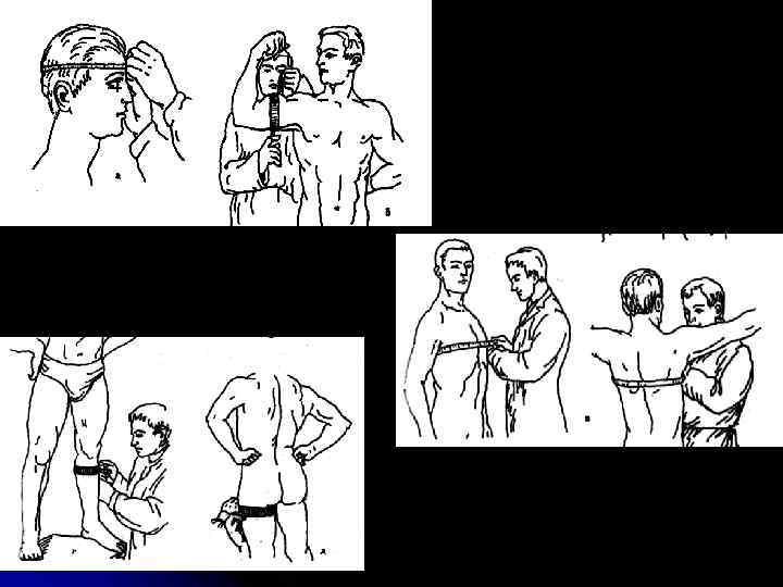 Одна из первых инструкций по антропометрии живого человека была разработана в 1888 г. по инициативе известного антрополога А. П. Богданова. Антропометрия включает определение: 1. линейных (продольных, поперечных, переднезадних) размеров; 2. обхватных размеров; 3. измерение массы тела.