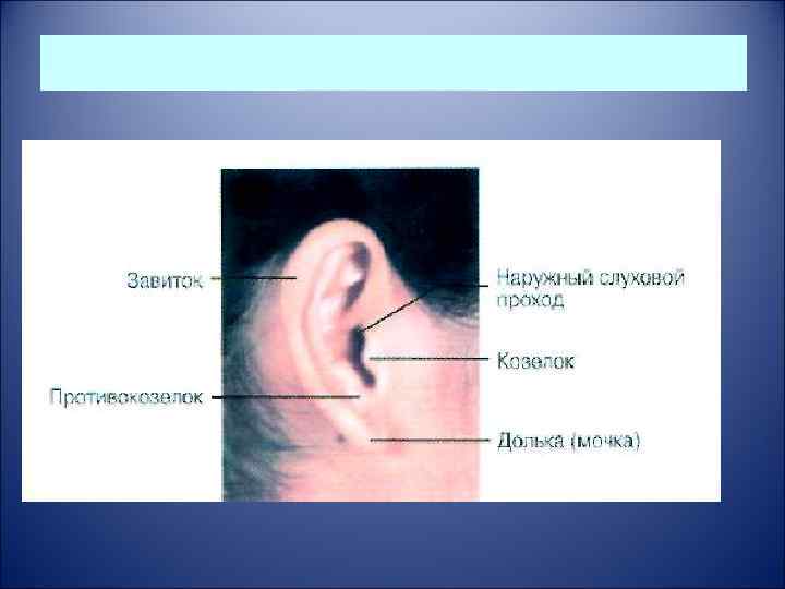 Орган слуха состоит из: • Наружного, среднего и внутреннего уха; • Наружное ухо представлено ушной раковиной и наружным слуховым проходом. Звуковые колебания проходят через наружный слуховой проход к барабанной перепонке, которая отделяет наружное ухо от среднего.