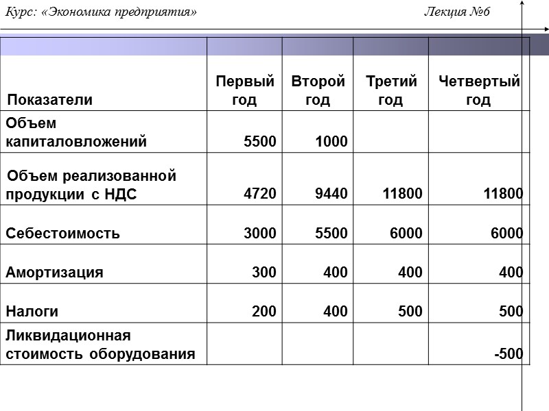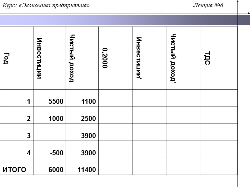 ЛЕКЦИЯ №4 ИНВЕСТИРОВАНИЕ 1. ДИСКОНТИРОВАННАЯ СТОИМОСТЬ Время Поток Скачать презентацию ЛЕКЦИЯ №4 ИНВЕСТИРОВАНИЕ 1. ДИСКОНТИРОВАННАЯ СТОИМОСТЬ Время Поток 31648-04_ehp-in.ppt Количество слайдов: 17 ЛЕКЦИЯ №4 ИНВЕСТИРОВАНИЕ 1. ДИСКОНТИРОВАННАЯ СТОИМОСТЬ Время Поток Инвестиций 6000 у.е. 1000 у.е. 1100 у.е. 1210 у.е. 1331 у.е. 1464 у.е. Поток Доходов 1 2 4 5 6 3 Итого 6715,61 у.е. 1610,51 у.е. Ставка дисконтирования Динамические методы ЭТАП 1 Дисконтированный доход Чистая текущая приведенная стоимость Срок окупаемости Индекс рентабельности Рентабельность При Е1