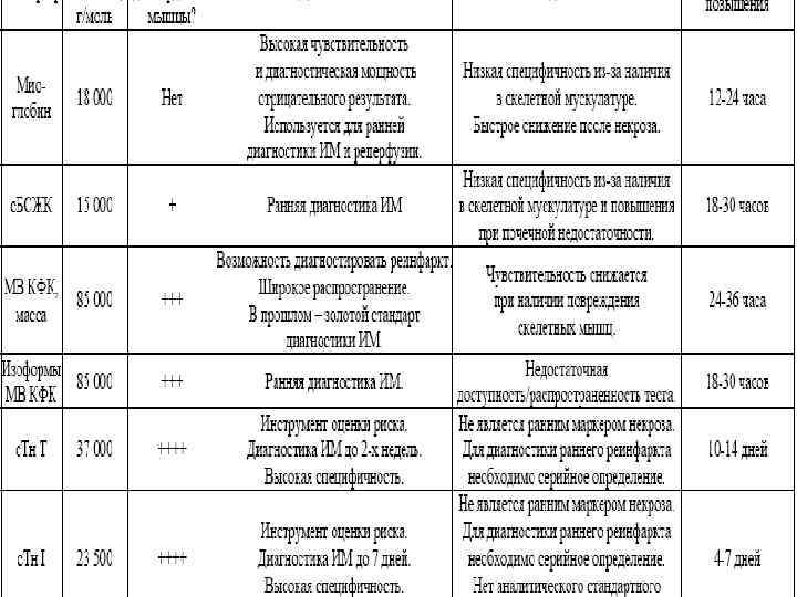 Лабораторная диагностика ИМ Гиперферментемия: миоглобин (от 1, 5 до 24 часов), максимум (5 -10 норм) к 6 -7 часу; тропонины Т и I (от 2 часов до 2 -х недель), максимум – 10 -24 часа; КФК , более кардиоспецифична МВ-фракция (от 3 часов до 3 -х суток), максимум (6 -12 норм) через 18 -24 часа; АСТ (8 часов - 4 суток), максимум (4 -8 норм) - через 18 -36 часов; ЛДГ (24 часа - 15 сутки), максимум (2 -6 норм) на 3 -6 сутки; при ИМ соотношение ЛДГ 1/ЛДГ 2 больше 1 Общий анализ крови: лейкоцитоз, ускорение СОЭ (признаки резорбционно-некротического синдрома)