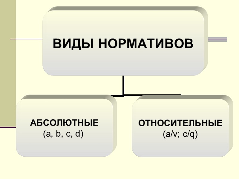 Абсолютные нормативы: нормативы штатной численности сотрудников; нормативы запаса ресурсов; нормативы длительности процессов; нормативы площадей производственных помещений; другие