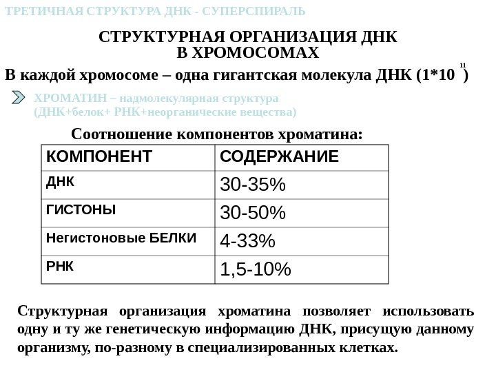 ТРЕТИЧНАЯ СТРУКТУРА ДНК — СУПЕРСПИРАЛЬ СТРУКТУРНАЯ ОРГАНИЗАЦИЯ ДНК В ХРОМОСОМАХ В каждой хромосоме – одна гигантская молекула ДНК (1*10 ) ХРОМАТИН – надмолекулярная структура (ДНК+белок+ РНК+неорганические вещества) 11 КОМПОНЕНТ СОДЕРЖАНИЕ ДНК 30 -35% ГИСТОНЫ 30 -50% Негистоновые БЕЛКИ 4 -33% РНК 1, 5 -10%Соотношение компонентов хроматина: Структурная организация хроматина позволяет использовать одну и ту же генетическую информацию ДНК, присущую данному организму, по-разному в специализированных клетках.