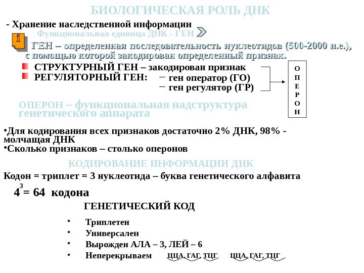 БИОЛОГИЧЕСКАЯ РОЛЬ ДНК — Хранение наследственной информации Функциональная единица ДНК — ГЕН – определенная последовательность нуклеотидов (500 -2000 н. е. ), с помощью которой закодирован определенный признак. СТРУКТУРНЫЙ ГЕН – закодирован признак РЕГУЛЯТОРНЫЙ ГЕН: ген оператор (ГО) ген регулятор (ГР) О П Е Р О НОПЕРОН – функциональная надструктура генетического аппарата КОДИРОВАНИЕ ИНФОРМАЦИИ ДНК • Сколько признаков – столько оперонов • Для кодирования всех признаков достаточно 2% ДНК, 98% — молчащая ДНК Кодон = триплет = 3 нуклеотида – буква генетического алфавита 4 = 64 кодона 3 ГЕНЕТИЧЕСКИЙ КОД • Триплетен • Универсален • Вырожден АЛА – 3, ЛЕЙ – 6 • Неперекрываем ЦЦА, ГАГ, ТЦГ