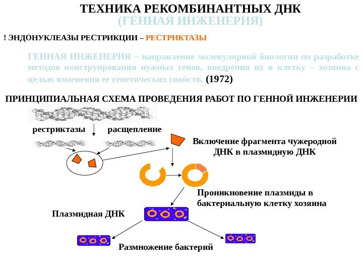 ТЕХНИКА РЕКОМБИНАНТНЫХ ДНК (ГЕННАЯ ИНЖЕНЕРИЯ) ! ЭНДОНУКЛЕАЗЫ РЕСТРИКЦИИ – РЕСТРИКТАЗЫ ГЕННАЯ ИНЖЕНЕРИЯ – направление молекулярной биологии по разработке методов конструирования нужных генов, внедрения их в клетку – хозяина с целью изменения ее генетических свойств. (1972) ПРИНЦИПИАЛЬНАЯ СХЕМА ПРОВЕДЕНИЯ РАБОТ ПО ГЕННОЙ ИНЖЕНЕРИИ рестриктазы расщепление Включение фрагмента чужеродной ДНК в плазмидную ДНК Проникновение плазмиды в бактериальную клетку хозяина Плазмидная ДНК Размножение бактерий
