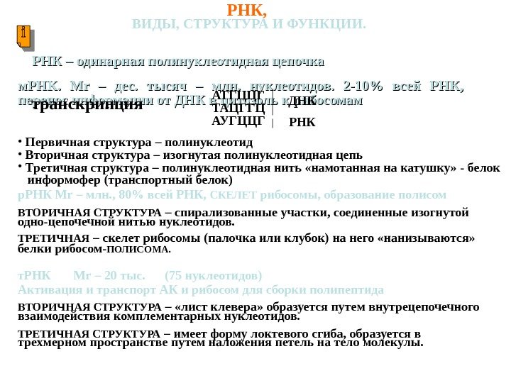РНК, ВИДЫ, СТРУКТУРА И ФУНКЦИИ. РНК – одинарная полинуклеотидная цепочка м. РНК. Mr – дес. тысяч – млн. нуклеотидов. 2 -10% всей РНК, перенос информации от ДНК в цитозоль к рибосомам транскрипция АТГЦЦГ ТАЦГГЦ ДНК АУГЦЦГ РНК • Первичная структура – полинуклеотид • Вторичная структура – изогнутая полинуклеотидная цепь • Третичная структура – полинуклеотидная нить «намотанная на катушку» — белок информофер (транспортный белок) р. РНК Mr – млн. , 80% всей РНК, СКЕЛЕТ рибосомы, образование полисом ВТОРИЧНАЯ СТРУКТУРА – спирализованные участки, соединенные изогнутой одно-цепочечной нитью нуклеотидов. ТРЕТИЧНАЯ – скелет рибосомы (палочка или клубок) на него «нанизываются» белки рибосом- ПОЛИСОМА. т. РНК Mr – 20 тыс. (75 нуклеотидов) Активация и транспорт АК и рибосом для сборки полипептида ВТОРИЧНАЯ СТРУКТУРА – «лист клевера» образуется путем внутрецепочечного взаимодействия комплементарных нуклеотидов. ТРЕТИЧНАЯ СТРУКТУРА – имеет форму локтевого сгиба, образуется в трехмерном пространстве путем наложения петель на тело молекулы.