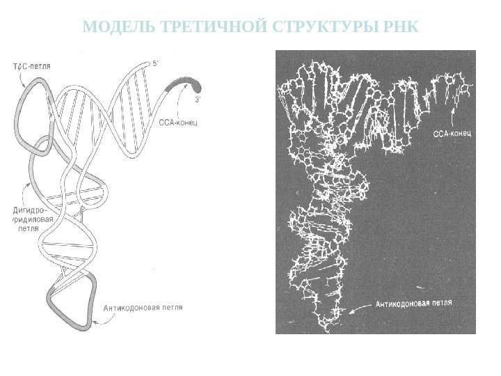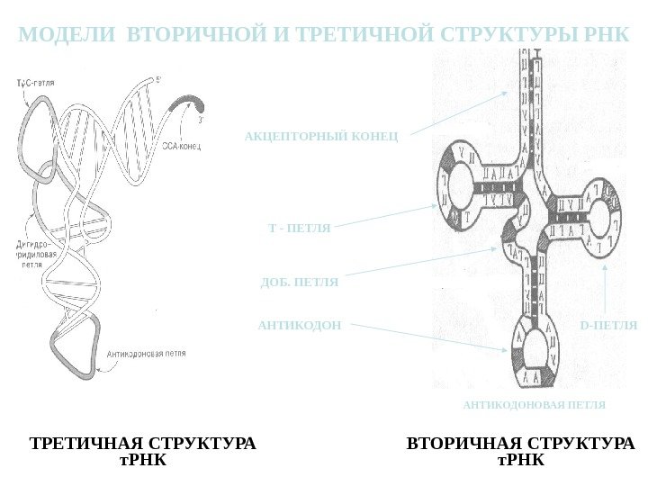 МОДЕЛИ ВТОРИЧНОЙ И ТРЕТИЧНОЙ СТРУКТУРЫ РНК ВТОРИЧНАЯ СТРУКТУРА т. РНКТРЕТИЧНАЯ СТРУКТУРА т. РНК АНТИКОДОН ДОБ. ПЕТЛЯАКЦЕПТОРНЫЙ КОНЕЦ АНТИКОДОНОВАЯ ПЕТЛЯ D -ПЕТЛЯT — ПЕТЛЯ
