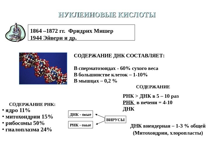 НУКЛЕИНОВЫЕ КИСЛОТЫ 1864 – 1872 гг. Фридрих Мишер 1944 Эйвери и др. СОДЕРЖАНИЕ ДНК СОСТАВЛЯЕТ: В сперматозоидах — 60% сухого веса В большинстве клеток – 1 -10% В мышцах – 0, 2 % СОДЕРЖАНИЕ РНК > ДНК в 5 – 10 раз РНК в печени = 4 -10 ДНК ВИРУСЫДНК — овые РНК — овые ДНК внеядерная – 1 -3 % общей (Митохондрии, хлоропласты)СОДЕРЖАНИЕ РНК: • ядро 11% • митохондрии 15% • рибосомы 50% • гиалоплазма 24%