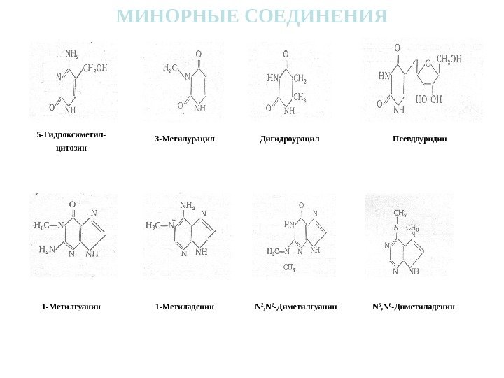 МИНОРНЫЕ СОЕДИНЕНИЯ 5 -Гидроксиметил- цитозин Дигидроурацил 3 -Метилурацил Псевдоуридин 1 -Метилгуанин 1 -Метиладенин N 2 , N 2 — Диметилгуанин N 6 , N 6 — Диметиладенин