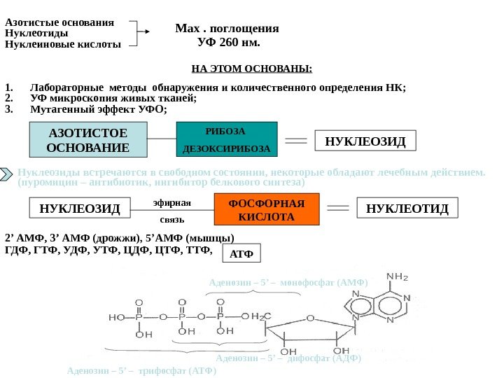Азотистые основания Нуклеотиды Нуклеиновые кислоты Мах. поглощения УФ 260 нм. НА ЭТОМ ОСНОВАНЫ: 1. Лабораторные методы обнаружения и количественного определения НК; 2. УФ микроскопия живых тканей; 3. Мутагенный эффект УФО; АЗОТИСТОЕ ОСНОВАНИЕ РИБОЗА ДЕЗОКСИРИБОЗА НУКЛЕОЗИД Нуклеозиды встречаются в свободном состоянии, некоторые обладают лечебным действием. (пуромицин – антибиотик, ингибитор белкового синтеза) НУКЛЕОЗИД ФОСФОРНАЯ КИСЛОТА НУКЛЕОТИДэфирная связь 2 ’ АМФ, 3 ’ АМФ ( дрожжи), 5 ’ АМФ (мышцы) ГДФ, ГТФ, УДФ, УТФ, ЦДФ, ЦТФ, ТТФ, АТФ Аденозин – 5 ’ – трифосфат (АТФ) Аденозин – 5 ’ – монофосфат (АМФ) Аденозин – 5 ’ – дифосфат (АДФ)