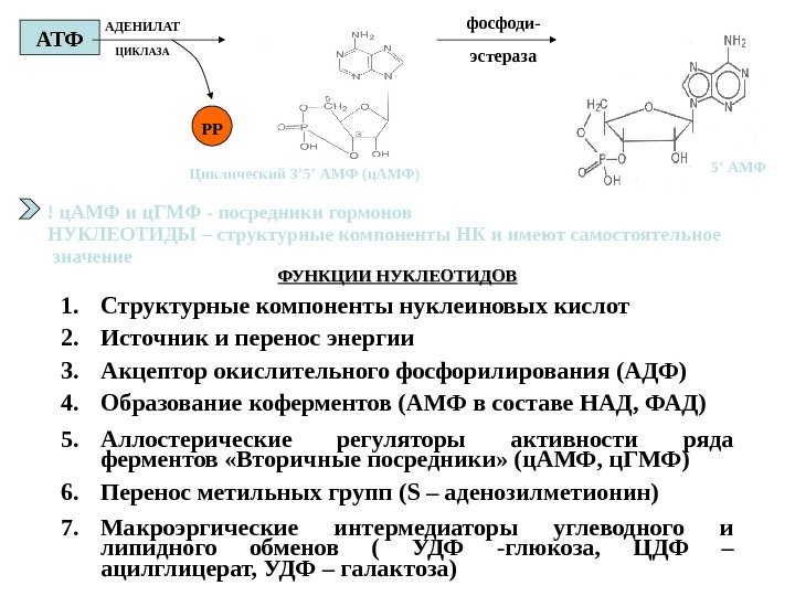 ФУНКЦИИ НУКЛЕОТИДОВ 1. Структурные компоненты нуклеиновых кислот 2. Источник и перенос энергии 3. Акцептор окислительного фосфорилирования (АДФ) 4. Образование коферментов (АМФ в составе НАД, ФАД) 5. Аллостерические регуляторы активности ряда ферментов «Вторичные посредники» (ц. АМФ, ц. ГМФ) 6. Перенос метильных групп ( S – аденозилметионин) 7. Макроэргические интермедиаторы углеводного и липидного обменов ( УДФ -глюкоза, ЦДФ – ацилглицерат, УДФ – галактоза)! ц. АМФ и ц. ГМФ — посредники гормонов НУКЛЕОТИДЫ – структурные компоненты НК и имеют самостоятельное значение. АТФ АДЕНИЛАТ ЦИКЛАЗА РР фосфоди- эстераза Циклический 3 ’ 5’ АМФ (ц. АМФ) 5’ АМФ