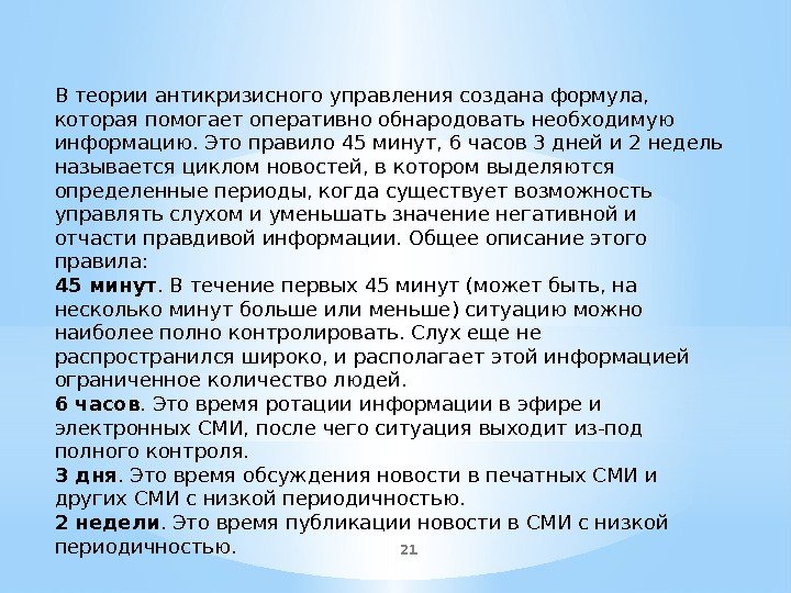 21 В теории антикризисного управления создана формула, которая помогает оперативно обнародовать необходимую информацию. Это правило 45 минут, 6 часов 3 дней и 2 недель называется циклом новостей, в котором выделяются определенные периоды, когда существует возможность управлять слухом и уменьшать значение негативной и отчасти правдивой информации. Общее описание этого правила: 45 минут. В течение первых 45 минут (может быть, на несколько минут больше или меньше) ситуацию можно наиболее полно контролировать. Слух еще не распространился широко, и располагает этой информацией ограниченное количество людей. 6 часов. Это время ротации информации в эфире и электронных СМИ, после чего ситуация выходит из-под полного контроля. 3 дня. Это время обсуждения новости в печатных СМИ и других СМИ с низкой периодичностью. 2 недели. Это время публикации новости в СМИ с низкой периодичностью.