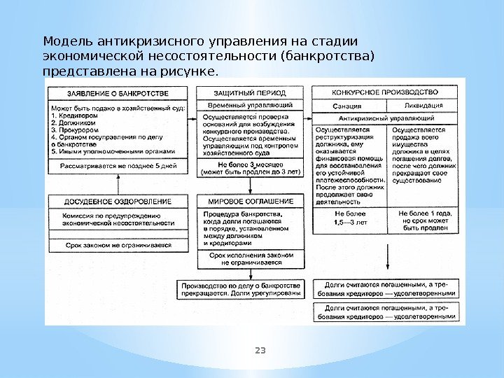 23 Модель антикризисного управления на стадии экономической несостоятельности (банкротства) представлена на рисунке.