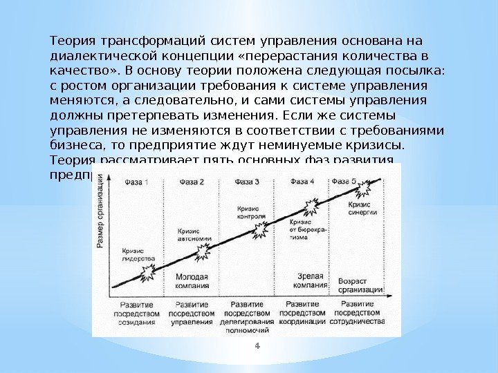 4 Теория трансформаций систем управления основана на диалектической концепции «перерастания количества в качество» . В основу теории положена следующая посылка: с ростом организации требования к системе управления меняются, а следовательно, и сами системы управления должны претерпевать изменения. Если же системы управления не изменяются в соответствии с требованиями бизнеса, то предприятие ждут неминуемые кризисы. Теория рассматривает пять основных фаз развития предприятия.