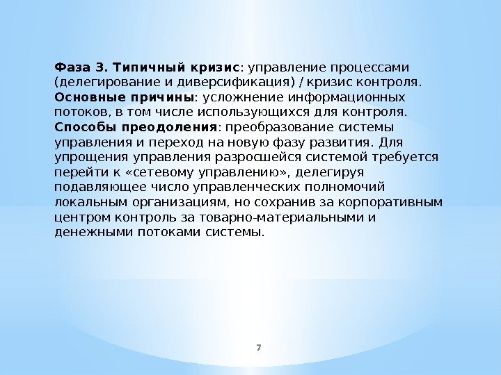 6 Фаза 2. Типичный кризис : управление функциями (формализация и построение структур) / кризис координации. Основные причины : привлечение новых компетенций, требуемых для развития бизнеса, что приводит к физическому росту функциональных структур. Они перестают гибко реагировать на изменения, их руководители превращаются в «экспертов» , окруженных многочисленной группой помощников. Горизонтальные связи между подразделениями рушатся, все информационные потоки переключаются непосредственно на начальников, стоящих во главе организационной структуры, которые трансформируют их вышестоящему руководителю для принятия решений. Поток информации к руководителю возрастает лавинообразно, вследствие чего наступает паралич власти. Сотрудники ориентируются на исполнение решений «эксперта» , не интересуясь влиянием собственной работы на общую эффективность компании, которая начинает резко снижаться. Способы преодоления : сознательное формирование систем процессного управления, нацеленных на достижение результата (диверсификация, делегирование полномочий и управление по результатам или целям), а не только выполнение функций, предписанных «экспертом» .