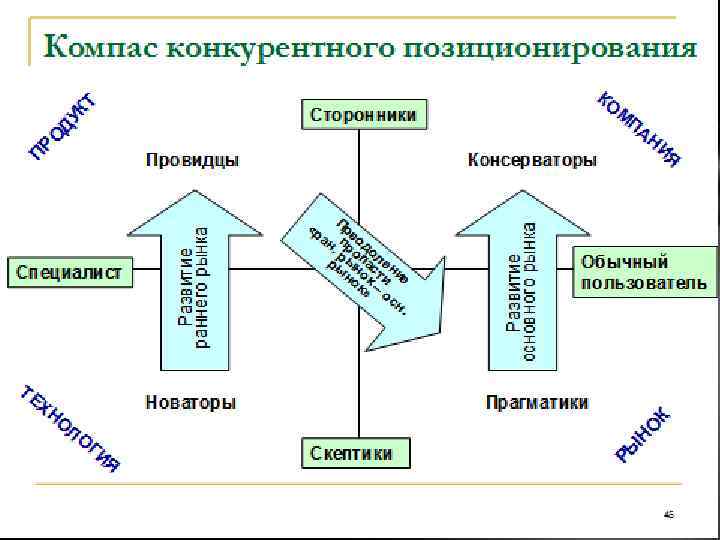 Специфика позиционирования на рынке инноваций На раннем рынке - демонстрация ярко выраженного технологического преимущества, которое затем превращают в доверие к продукту, т. е. ориентация на продукт. На основном рынке - демонстрация преимущества лидерства на рынке, которое затем превращают в доверие к компании, т. е. ориентация на рынок.
