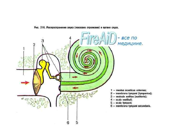 Среднее и внутреннее ухо. A. Строение среднего и внутреннего уха: колебания барабанной перепонки сообщаются слуховым косточкам, которые передают их во внутреннее ухо через овальное окно. Б. Улитка показана в развернутом виде: колебания перилимфы вестибулярной лестницы сообщаются через геликотрему перилимфе барабанной лестницы, заставляя колебаться основную мембрану. Усиление звуковых колебаний в происходит за счёт особого рычажного сочленения слуховых косточек. Кроме того, площадь овального окна (3, 2 мм 2) значительно меньше такового барабанной перепонки (70 мм 2). Благодаря этому происходит усиление давления звуковых волн на мембрану овального окна. Т. о. , рычажный механизм обеспечивает передачу звуковой энергии из воздушной среды в жидкую почти без потерь.