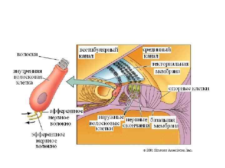 Волосковые клетки представляют собой видоизмененные нейроны, у которых около 50 дендритов. Они представляют собой микроворсинки; в их мембране имеются белки-каналы, который реагирует на отклонение микроворсинки. Белки находятся у каждой микроворсинки с одной стороны, поэтому клетки по-разному реагирует на ток эндолимфы с разных сторон. Т. о. , волосковые рецепторы реагируют на векторные силы, т. е. определяют направление и величину силы. К волосковым рецепторам подходят нервные окончания. Нервные окончания сливаются в улитковый корешок, а затем в преддверно-улитковый нерв, в составе которого и входят в задний мозг. Желтым обозначены специфичные белки, красной жирной стрелкой - ток эндолимфы, при котором мебрана деформируется так (красные тонкие стрелки), что специфичные белки не конформируют, зеленой жирной стрелкой - ток эндолимфы, при котором дендрит согнется так (зеленые тонкие стрелки), что вызовет возбуждение волосковой клетки