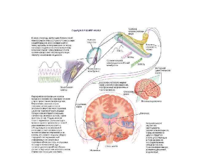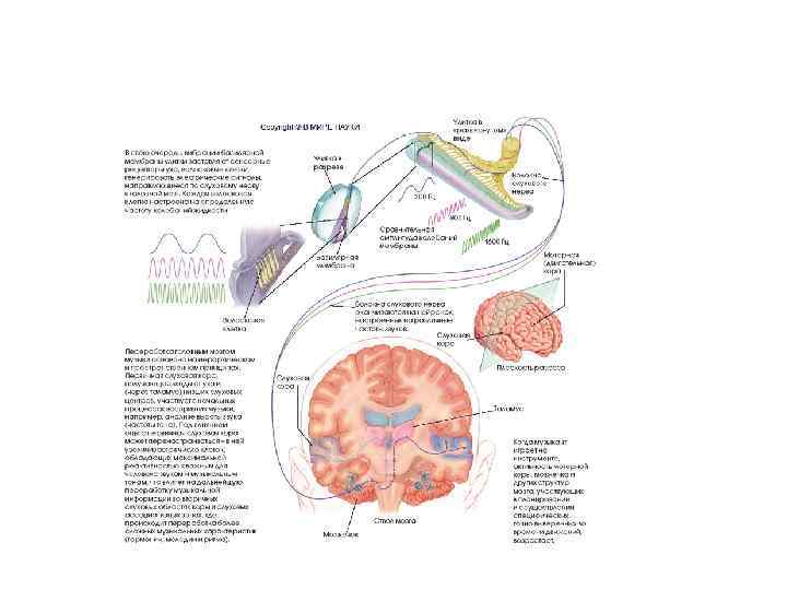 Они также содержат нейроны, которые избирательно реагируют на звуки различной продолжительности, на повторяющиеся звуки, на шумы с широким частотным диапазоном и т. п. В слуховой коре происходит объединение информации о высоте тона и его интенсивности, о временных интервалах между отдельными звуками.