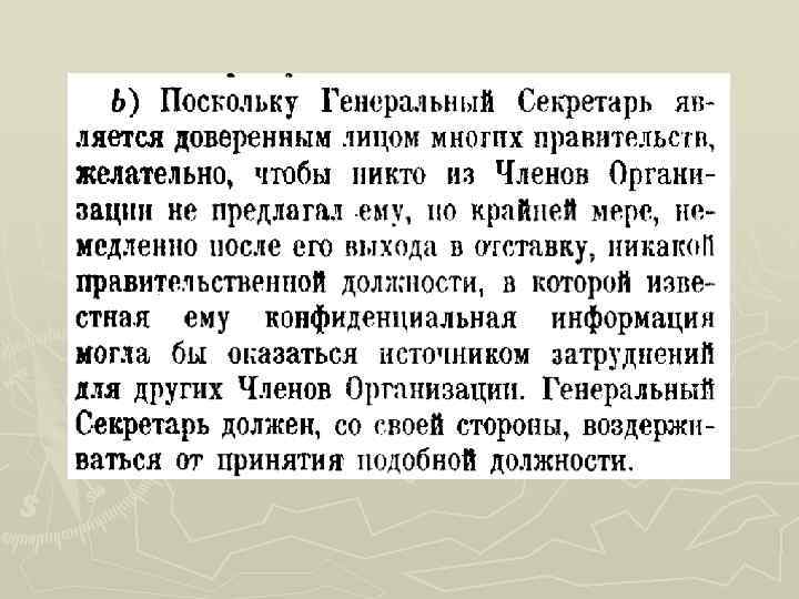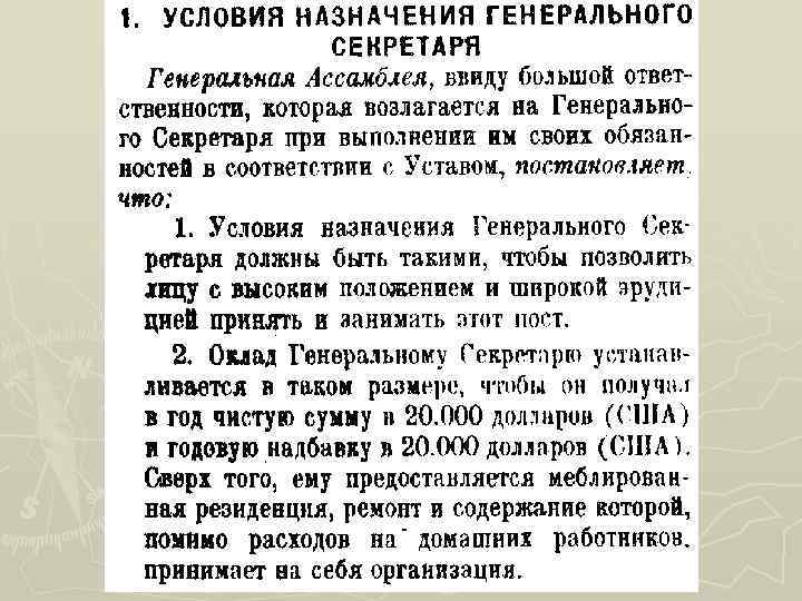 Бывшие Генеральные секретари Трюгве Ли (Норвегия) (19461952 годы) У Тан (Мьянма) (1961 -1971 годы) Даг Хаммаршельд (Швеция) (1953 -1961 годы) Курт Вальдхайм (Австрия) (1972 -1981 годы)
