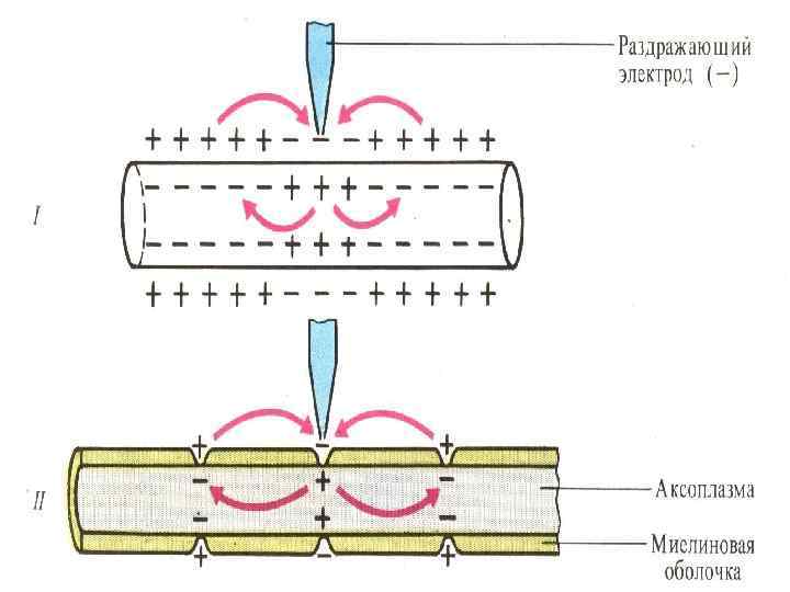 В безмякотных НВ возбуждения (ПД) проводятся беспрерывно, декрементно (затухая). По мякотным НВ – сальтаторно, перепрыгивая по перехватам Ранвье (иногда через 5 -6 перехватов). Чем больше диаметр НВ, тем больше межперехватное расстояние и соответственно скорость проведения.