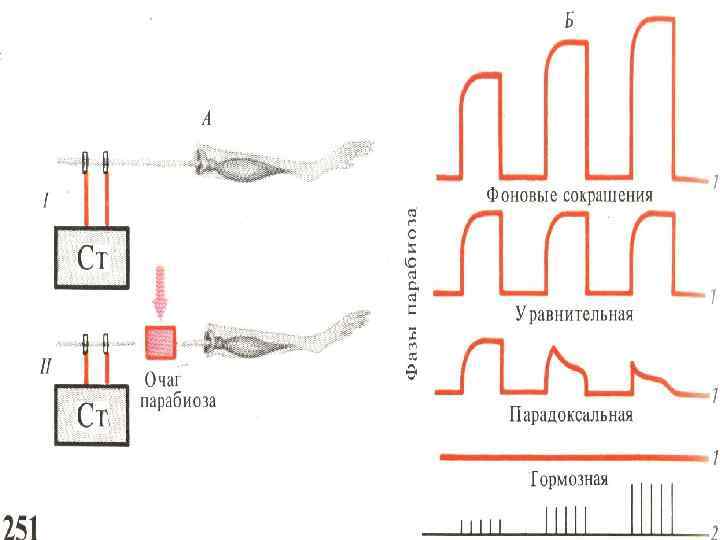 Парабиоз протекает в 3 фазы : 1. Уравнительная – ответные реакции одинаковы не зависимо от силы. 2. Пародоксальная - ответные реакции противоположны (сильному-слабый, …) 3. Тормозная – на все виды раздражения возбуждение не наблюдается.