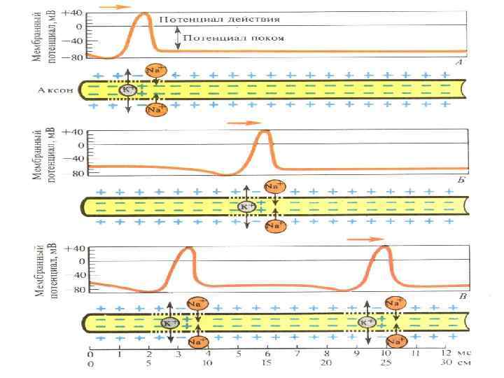 Мембраны нейрона и НВ имеют кабельные свойства, в них возникают (суммируются) градуальные потенциалы(декрементные) и ПД(бездекрементные).
