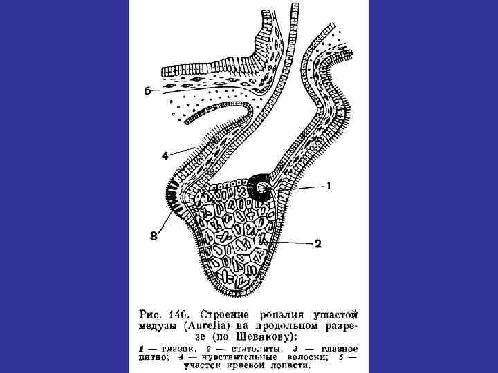 Продольный разрез через ропалий медузы Carybdea. Налево разрез прошел через 2 главных глаза ропалия, пустое пространство внизу ропалия - статоцист (статолиты растворились при изготовлении препарата) (по Шевякову): 1 - хрусталик, 2 - светочувствительный слой ретинальных клеток, 3 - стекловидное тело, 4 - энтодермальная выстилка продолжающегося в ропалий радиального канала (5), 6 - эктодерма ропалия