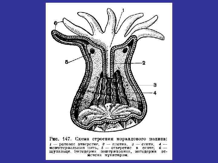 Класс Anthozoa (Коралловые полипы) - Морские одиночные, прикреплённые и плавающие колонии - Тело двухслойное - Имеют скелет: 1) У 6 -и лучевых скелет эктодермальный 2) У 8 -и лучевых формируется из периферического фагоцитобласта (энтодермальный)