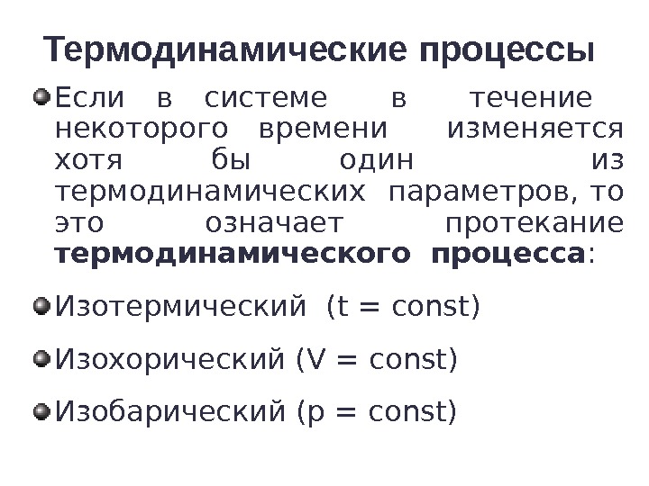 Термодинамические процессы Если в системе в течение некоторого времени изменяется хотя бы один из термодинамических параметров, то это означает протекание термодинамического процесса : Изотермический ( t = со nst ) Изохорический ( V = со nst ) Изобарический (р = со nst )
