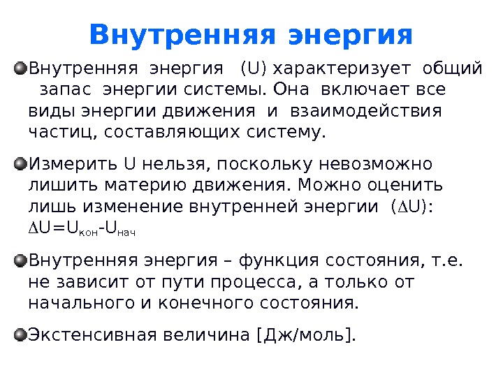Внутренняя энергия ( U ) характеризует общий запас энергии системы. Она включает все виды энергии движения и взаимодействия частиц, составляющих систему. Измерить U нельзя, поскольку невозможно лишить материю движения. Можно оценить лишь изменение внутренней энергии ( U): U = U кон — U нач Внутренняя энергия – функция состояния, т. е. не зависит от пути процесса, а только от начального и конечного состояния. Экстенсивная величина [ Дж/моль ].