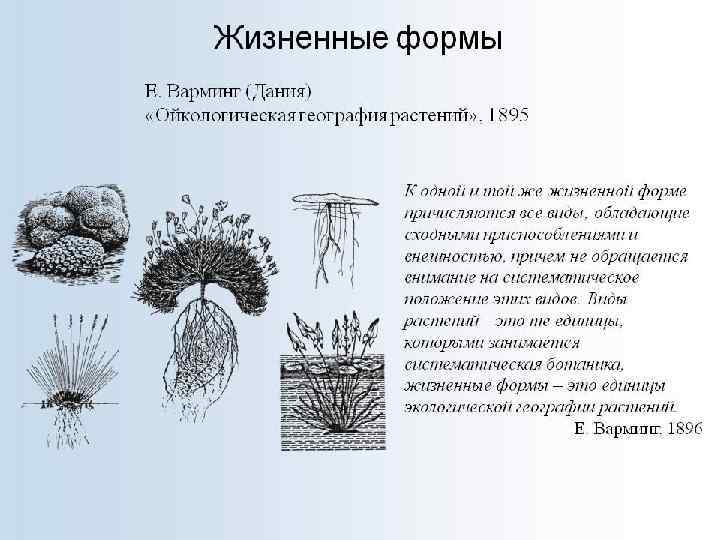 • Сам термин «жизненная форма» и его определение были введены в экологию именно при исследовании растительности. Это сделал датский ботаник Йоханнес Варминг в 1884 г. Он определял жизненную форму как форму, в которой вегетативное тело растения находится в гармонии с внешней средой в течение всей жизни. Начало изучению жизненных форм положил немецкий естествоиспытатель Александр Гумбольдт. Он предложил выделять те жизненные формы, которые характеризуют физиономичность ландшафта: деревья, кустарники, травы, лианы и т. д. Так, в качестве особых он выделял формы кактусов, составляющих облик пейзажа в Мексике, хвойных, определяющих вид тайги, указывал формы бананов, пальм, злаков. Затем жизненные формы начали классифицировать по экологическим признакам.