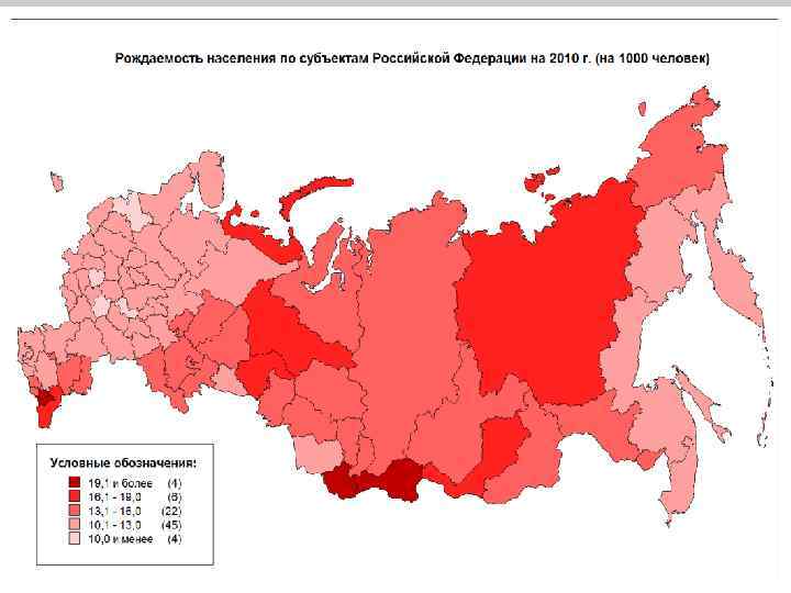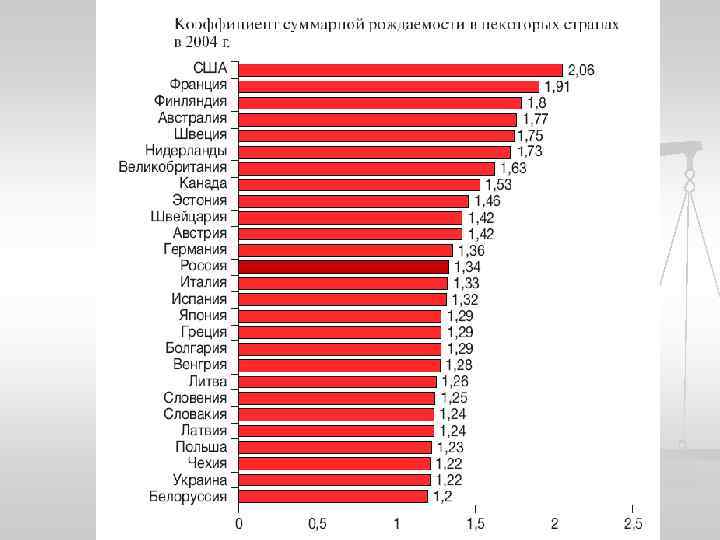 Общий коэффициент рождаемости Среднее число живорожденных детей на 1000 чел. , 2000 -2010 гг. Наибольший 1 Нигер 2 Ангола 3 Сомали 4 Уганда 5 Конго 6 Либерия 7 Гвинея-Бисау 8 Мали 9 Сьерра-Леоне 10 Чад 11 Буркина-Фасо 12 Афганистан 13 Йемен 14 Малави 15 Бурунди 16 Конго-Браззавиль 17 Руанда 18 Экваториальная Гвинея 19 Гвинея 20 Эфиопия 21 Замбия 22 Мавритания Наименьший 55, 2 52, 3 52, 1 50, 7 50, 2 50, 0 49, 9 49, 6 48, 4 47, 8 47, 4 45, 0 44, 6 44, 2 44, 0 43, 1 42, 9 42, 5 42, 2 41, 8 1 Латвия 2 Болгария 3 Словения 4 Украина 5 Гонконг 6 Австрия 7 Россия 8 Эстония 9 Германия 10 Швейцария 11 Беларусь 12 Чехия 13 Венгрия 14 Италия 15 Литва 16 Греция 17 Япония 18 Испания 19 Польша 20 Армения 21 Босния 22 Макао 7, 8 7, 9 8, 3 8, 4 8, 5 8, 6 8, 7 8, 8 8, 8 9, 1 9, 2 9, 3 9, 6 9, 7