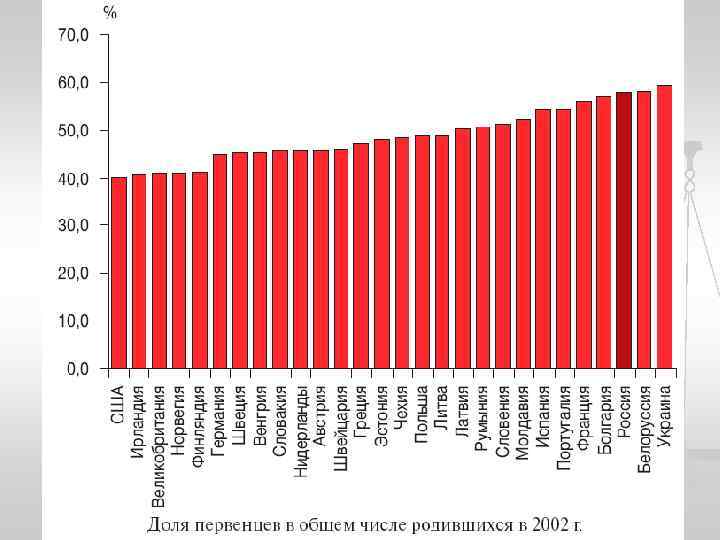 Доля рожавших женщин в возрастной группе до 20 лет, 2000 -2010 гг. Наибольшая, % 1 Бангладеш 2 Конго 3 Либерия 4 Никарагуа 5 Нигер 6 Гвинея 7 Экваториальная Гвинея 8 Мали 9 Уганда 10 Бразилия 11 Чад 12 Кот-д'Ивуар 13 Непал 14 Сьерра-Леоне 15 Зимбабве 16 ЦАР 17 Коста-Рика 18 Доминиканская Респ. 19 Габон 20 Гвинея-Бисау 21 Ямайка 22 Нигерия 23 Венесуэла Наименьшая, % 25 25 25 24 23 23 23 21 21 21 20 20 1 Китай 2 Япония 3 Нидерланды 4 Ю. Корея 5 Швейцария 6 Алжир 7 Бельгия 8 Дания 9 Гонконг 10 Италия 11 Ливия 12 Люксембург 13 Норвегия 14 Сингапур 15 Словения 16 Швеция 17 Тунис 18 Кипр 19 Финляндия 20 Греция 21 Израиль 22 Макао 23 Катар 24 Испания 1 1 1 2 2 2 3 3 3 3