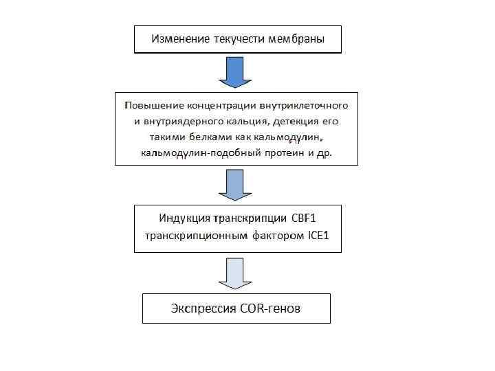 Общий вид холодового ответа • Мембранная ригидификация вызывает накопление Са 2+ в цитоплазме, а также в ядре. В дальнейшем преобразовании этого сигнала задействованы Са 2+ сенсоры – Ca. M (calmodulin), CML (calmodulin-like), CDPK (Ca 2+ dependent protein kinase) и другие. • В результате повышается экспрессия генов COR cold responsive genes. Это происходит за счет активности транскрипционного фактора CBF- C repeat binding factors. • CBF 1/DREB 1 связываются в промоторной области COR-генов с последовательностью A/GCCGAC.