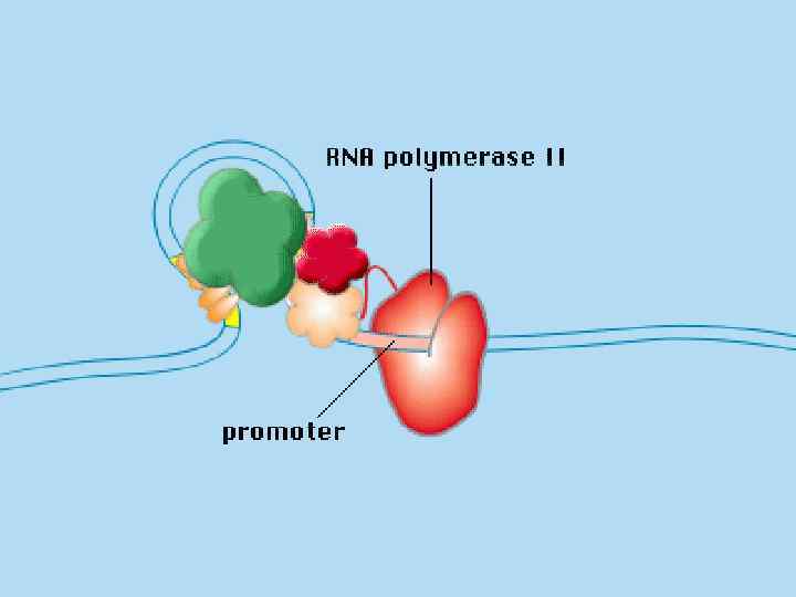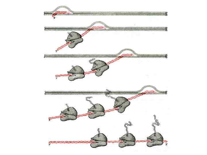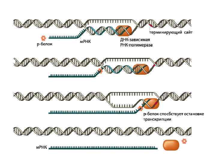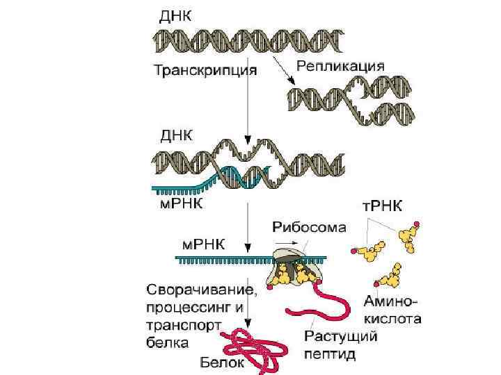 Основные определения Экспрессия генов – это процесс реализации информации, закодированной в структуре ДНК, на уровни м. РНК и белков. 1. Транскрипция – переписывание генетической информации с ДНК на м. РНК. 2. Процессинг - расщепление первичных транскриптов т. РНК, р. РНК и дальнейшая их модификация 3. Сплайсинг вырезание в молекуле м. РНК интронов (некодирующих последовательностей) и сшивание экзонов (кодирующих последовательностей) в единую цепь нуклеотидов у эукариот. 4. Трансляция – синтез пептидной цепи в соответствии с последовательностью кодонов (сочетаний из 3 -х нуклеотидов) м. РНК. Различают 3 этапа трансляции – инициация (начало), элонгация (продолжение) и терминация (окончание). 5. Последний этап: созревание белков – пострансляционная модификация полипептидных цепей.