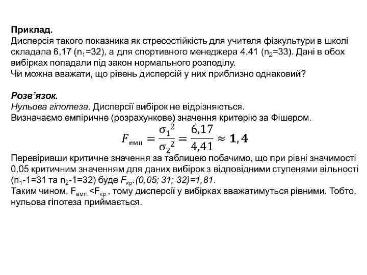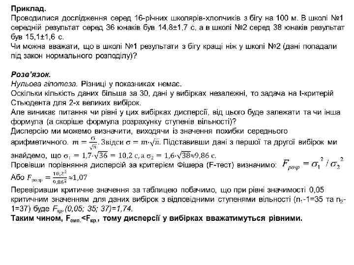 Отже, вибірки незалежні, дисперсії рівні. Значить підходить формула: А ступені вільності обрахуємо за формулою: k=n 1+n 2 -2 Тобто , а k=38+36 -2=72 За таблицею для даних ступенів вільності критичне значення буде: tкр. (0, 05; 37; 35)=1, 99. Оскільки розрахункове значення (емпіричне) менше за критичне (табличне), тобто tрозр.