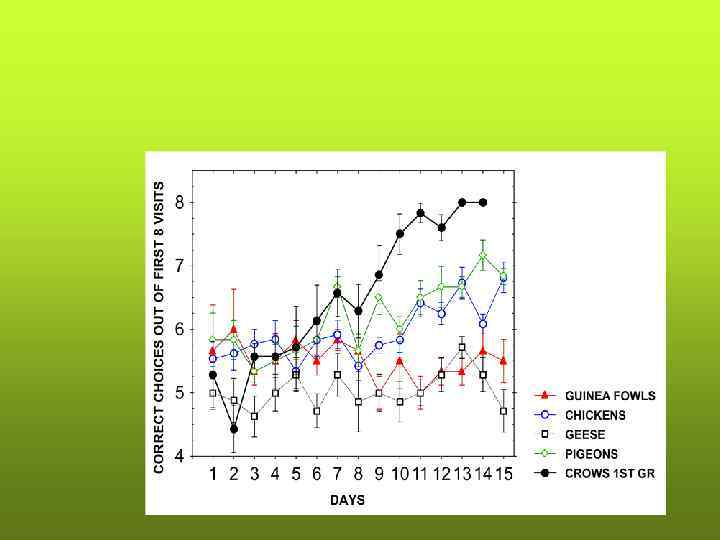 7 Hooded crows in the giant radial maze Hooded crows learned fast to find all baits without errors (Lipp et al. , 2001). The results in domestic birds were worse in spite of their less fearfulness