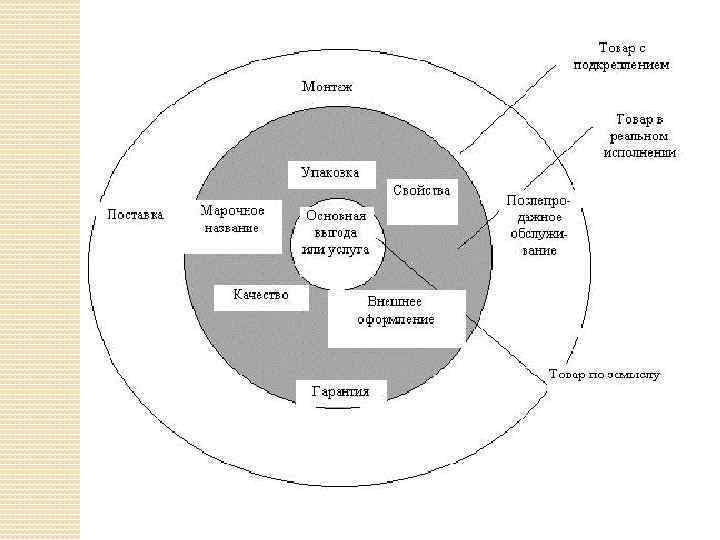 Товар можно рассматривать с позиции трех уровней: 1. Товар по замыслу. 2. Товар в реальном исполнении. 3. Товар с подкреплением.