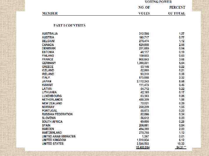 Число голосов в МБРР (в %) (на 30. 06. 2015 США – 16, Япония - 7, 49 Китай – 4, 83, Германия – 4, 38, Великобритания – 3, 93 Франция - 3, 93 Индия – 3, 05 Саудовская Аравия – 3, 03, Италия – 2, 47 Россия – 2, 83 Подписанный капитал $252, 8 млрд.