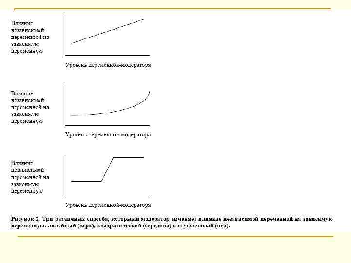 n Чтобы измерить влияния модератора, надо заранее знать, как модератор изменяет влияние независимой переменной на зависимую. Невозможно оценить общую гипотезу, что влияние независимой переменной изменяется как функция модератора, т. к. модератор имеет множество уровней
