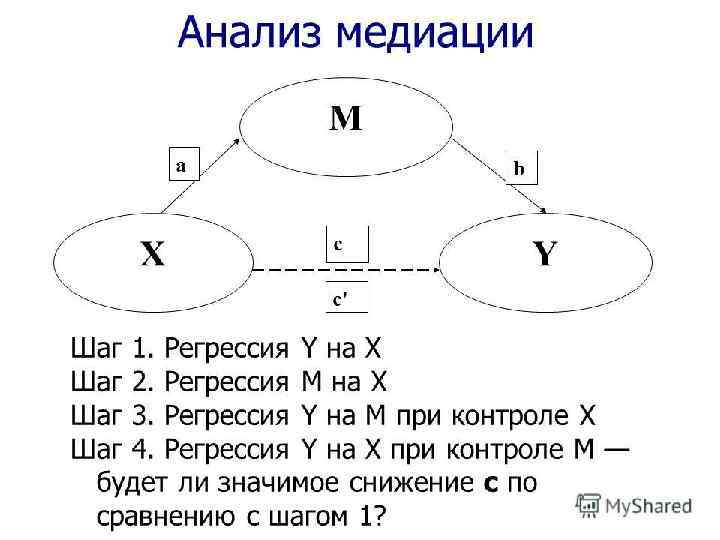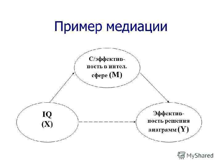n Ш Ш n Использование множественной регрессии для оценки модели опосредования требует двух следующих допущений: не должно быть ошибки измерения в медиаторе зависимая переменная не вызывает медиатор Медиатор, поскольку он зачастую является внутренней, психологической переменной, вероятнее всего будет измеряться с ошибкой. Присутствие ошибки измерения в медиаторе имеет тенденцию приводить к недооценке влияния медиатора и переоценке влияния независимой переменной на зависимую переменную, когда все коэффициенты являются позитивными.