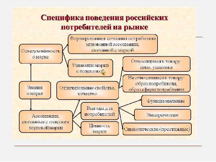 Поведение потребителей в маркетинге. o Выявление предпочтений потребителей, их отношения к определенным продуктам/маркам, степени информированности о них: исследование уровня известности различных марок; определение степени лояльности потребителей к маркам, выявление требований, предъявляемых потребителями к товару/услуге; выявление основных конкурентов марки и их позиционирования по уровню знаний и потребления, соотношению воспринимаемого качества и цены, потребительским свойствам, имиджевым характеристикам.