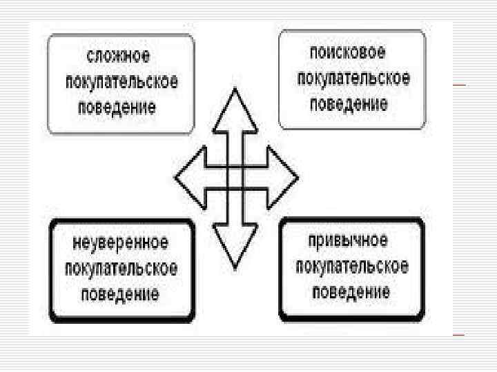 Поведение потребителей в маркетинге o Поведение потребителя существенно меняется в зависимости от того, какой товар он покупает. Чем сложнее принять решение о покупке, тем больше требуется участников и тем осторожнее ведет себя потребитель. o Различают четыре типа покупательского поведения. В зависимости от модели поведения потребителя необходимо выбирать наиболее выгодную стратегию маркетинга.