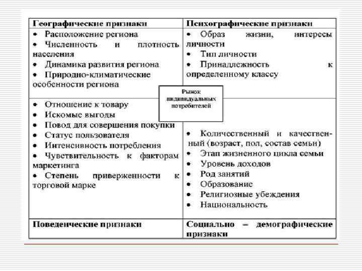 Характеристика потребителей по сегментам рынка Сегмент рынка Суперноваторы Характеристика потребителей сегмента Склонны к риску, эксперименту, обладают высоким социальным статусом. Входят в высшую группу по доходам. Жители городов. Новаторы Имеют сходные с суперноваторами характеристики, но в меньшей степени склонны к риску. Высокое соц. положение. Данные из СМИ. Обычные потребите ли Избегают риска. Отсутствует чувство лидерства. Чаще являются жителями небольших городов или сельских районов Консерва- Осторожны, не любят изменений. Чаще являются представителями торы мало престижных профессий. Входят в группу с относительно низкими доходами Суперкон серваторы Относятся подчеркнуто отрицательно к любым изменениям. Как правило, лишены творческого воображения. Могут принадлежать к слоям с высокими и низкими доходами Приверже нцы марки Склонны к «фирменному» образу жизни. Как правило, обладают высокими доходами. Чаще являются лицами старше 40 лет. Готовы переплачивать за престижные товары