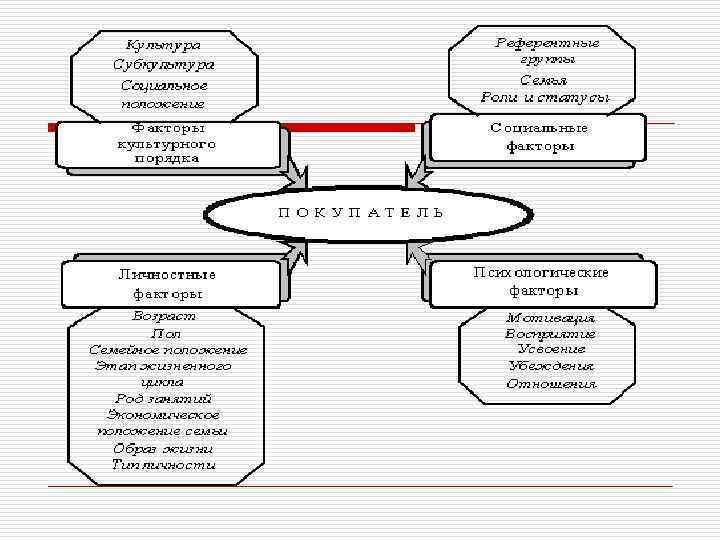 Факторы влияния на поведение потребителей o Роли и статусы. На протяжении всей своей жизни индивид участвует в деятельности многих групп - семьи, друзей, различных организаций. Его позиции в каждой группе определяются исполняемой ролью и статусом. Роль — это набор действий, исполнения которых ожидают от человека окружающие его лица. Очень важно, чтобы маркетолог осознавал потенциальную возможность превращения продукта и торговой марки в символы статуса.